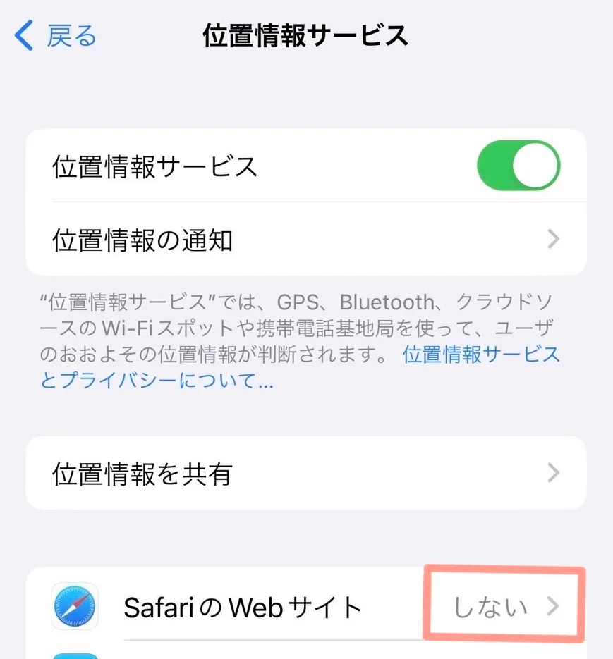 位置情報サービスの中から、Safariを探します。