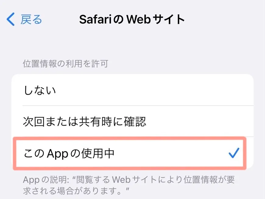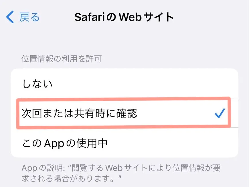設定を「次回または共有時に確認」か、「このAppの使用中」に変更します。